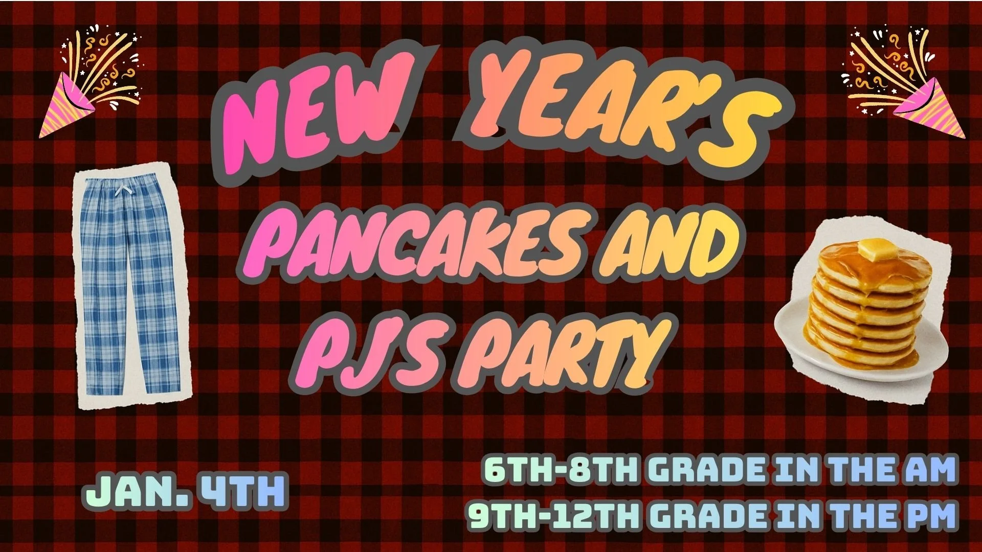 STUDENTS PJS & PANCAKES | Students, join us as we kick off the new year with pjs & pancakes for all students, Sunday, Jan. 4th. Middle school will meet during their normal Sunday morning time and high schoolers will meet 6:30-8pm. Questions? Contact Brandon.
