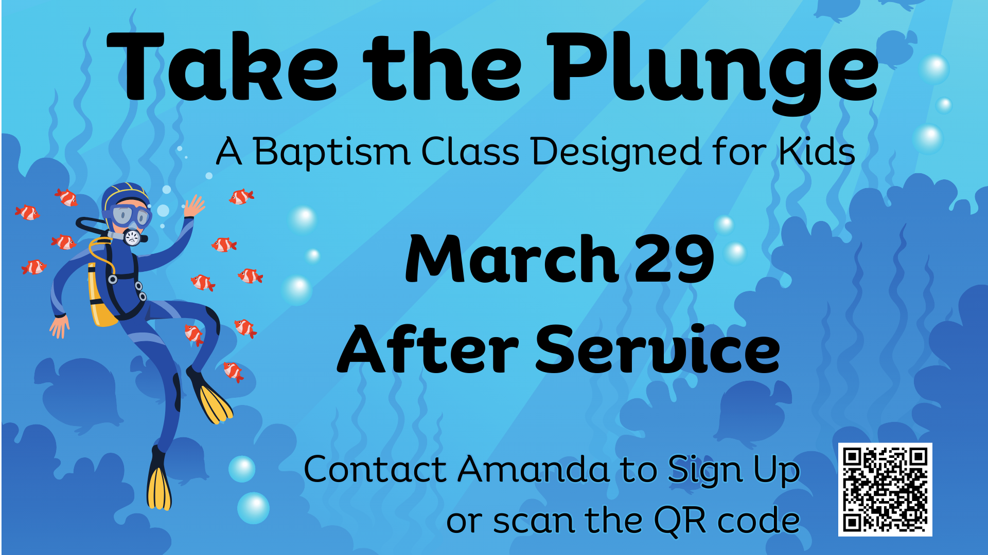 CHILDREN'S BAPTISM CLASS | This one hour experience is a great way to introduce your kids to committing their lives to Christ and understanding what follows their decision. Amanda is offering an in-person class after service on Sunday, March 29th in the children's wing for anyone interested in learning more. Sign ups are required. Reach out to Amanda to sign up or for more information.